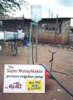 The photo shows a signboard and exhibit of a Super Money Maker pressure irrigation pump. A contractor has made and sold many by transporting the exhibits by bus from one village to another on market days. However, be aware that foot pumping is so tiresome, when pumping from a few metres depth, that customers will come back complaining they have been cheated.