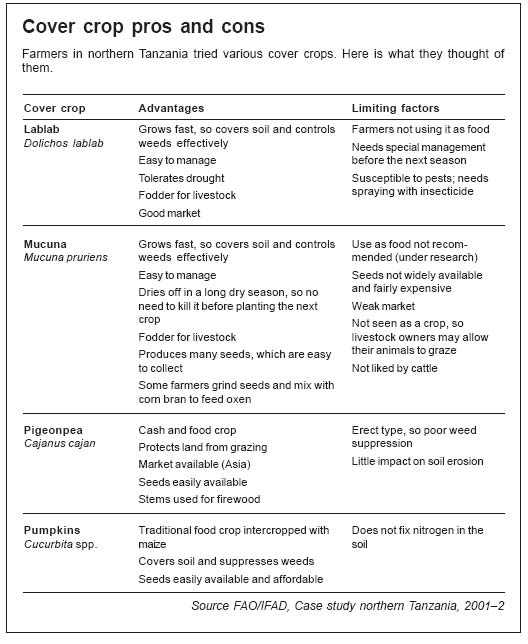 - Select crops that cover the soil quickly and give less work for land preparation, weeding, producing and harvesting the seeds. Species with big pods and grains like pigeon pea and mucuna are easier to deal with than species with small pods such as vetch and grasses.