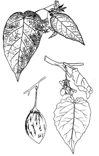 | A large evergreen shrub to 3 m with characteristic umbrella-like branching Bark: Young stems are shiny, old stems with rounded leaf scars. Leaves: Alternate, large, rather heart-shaped, 40x30m cm, softly hairy, drooping in heat, on a long stalk Flowers: In fragrant hanging groups from older stems. Each flower is 5-lobed, white-pink and with a darker stripe. Fruit: In clusters, egg-shaped to 7 cm long, abundant, on long stems, shiny orange-red to purple. |