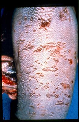 The virus attacks all the mucosal surfaces in the body causing inflammation and ulceration and it is the results of this which cause the symptoms seen. Erosions can occur throughout the intestinal tract, lesions are seen in the mouth, nose and muzzle, there is often foul smelling diarrhoea containing shreds of intestine, mucus and blood. Occasionally diarrhoea may be so severe as to appear like water or paralysis of the gut may occur with no sign of faecal material. Other signs which may occur include discharges from the nose, excessive tears and lameness due to eruptive lesions of the interdigital cleft and coronary band. .Animals are reluctant to eat and there is drooling and even frothing from the mouth. High mortality with moderate morbidity is to be expected. In Mucosal Disease, where a persistently infected animal, usually under 2 years of age, is superinfected with internally acquired cytopathogenic virus, the mortality is very high, death occurring within a few days of onset, with fever, dysenteric diarrhoea, lack of appetite, dehydration, ulceration throughout the gastro-intestinal tract and erosive lesions in the mouth and nose.