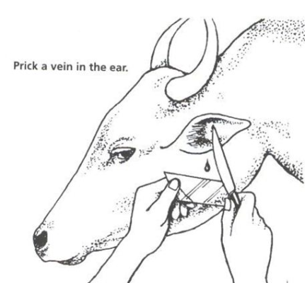 1. Blood smears should be taken. Disinfect a small area at the base of the animal's ear. Prick a small hole with a disinfected needle so that a drop of blood appears. A small drop of blood is then touched with a clean glass slide. With another glass slide touch the drop with one end of the slide until the blood spreads along the angle between the two slides. Then push the upper slide along the length of the lower slide so that it draws the blood after it. Wave the slide in the air and it should dry almost immediately if the smear is of the correct degree of thinness. Place inside a clean envelope. Do NOT stick two smears together. So doing renders both useless for diagnostic purposes.