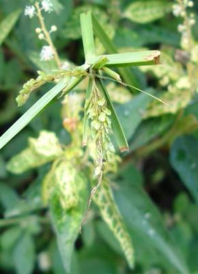 Sedges are grass-like plants widely distributed especially in the tropics and subtropics belonging to the genus Cyperus in the family Cyperaceae. The differences easiest to see between sedges and grasses are 1) that grass stems are usually but not always round in cross section, while sedge stems are more or less triangular; 2) sedge leaves are spirally arranged in three ranks while grasses have alternate leaves forming two ranks; and 3) leaf sheaths (lower part of a leaf enclosing the stem) in grasses are split whereas leaf sheaths of sedges are not split. Sedges are mostly found in moist areas such as wetlands, but are also common constituents of forest-margin vegetation. Like most tropical plants, they are sensitive to frost. Renewed attention is being paid to these plants due to their critical role in wetland ecosystems.
