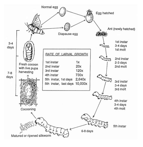 Silkworm Bombyx mori (L), the source for production of fabulous silk and sericulture industry, has been domesticated more than 4000 years ago. Its adoptability to environmental conditions is different from that of the wild insects and the rearing techniques vary to suit the requirements under different ecological conditions. To find out more about business viability of silk production, please link to Sericulture as a business and to find out more about growing mulberry to feed silkworms, please link to Mulberry for silkworms.