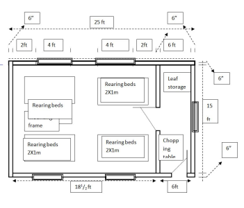 The size of the rearing house is determined by size of mulberry orchard and amount of silkworm to be reared. For example, a small scale farmer with