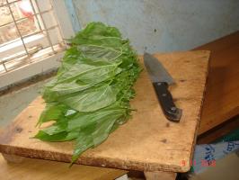 2. Chop tender (2nd and 3rd leaf) mulberry leaves into small pieces approximately equal to the size of the hatched silkworm larvae and sprinkle over the egg card. The hatched silkworms will crawl onto the chopped leaves and start feeding. Later the cards are removed and anz larvae still left on paraffin paper or newspaper are tapped gently onto the rearing bed. When all larvae are on the rearing beds, then the first feeding is given.