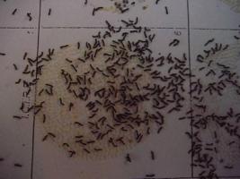 1. The hatched worms are brushed with a feather from the egg card directly onto the rearing bed. Care must be taken not to injure the worms.