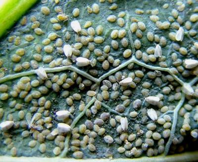 Adults and eggs of the cabbage whitefly (Aleyrodes proletella).