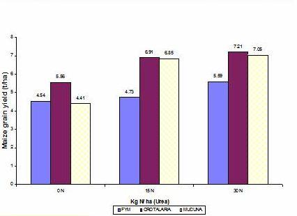 Higher maize yields are obtained by combining green manure legume with FYM and inorganic N. Combining green manure legume with inorganic fertilizers saves on fertilizer requirement (Figure). Application of 15 kg N ha-1 to the GM treatment increased maize yields by 38%, but doubling the N rate only increased yields by an additional 3%. On the other hand, maize grain yield in FYM treatments only increased by 4% after application of 15 kg N ha-1, while doubling the N rate to 30 kg ha-1 increased yield by 23 %. These results suggest that maize grain yield can be greatly improved by integrating GM, FYM, and inorganic nitrogen.