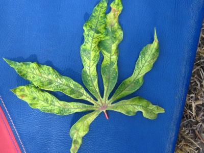 African Cassava Mosaic Disease (ACMD). The leaves of this local cultivar of cassava are expressing severe ACMD symptoms.