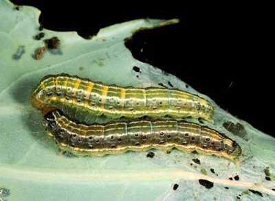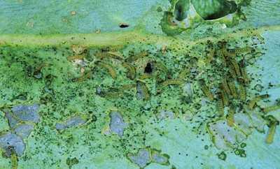Cabbage moth larvae: Upon hatching, larvae feed together on leaves and complete 5 instars in about 12 days.