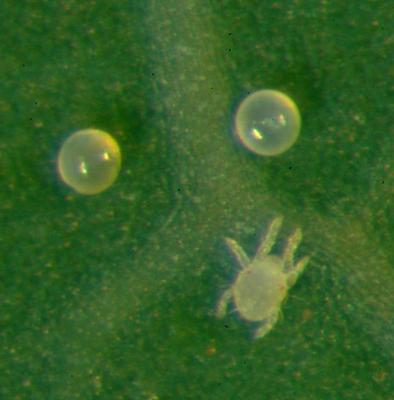 Eggs and larva of the cassava green mite (Mononychellus tanajoa), real size 0.2 mm.