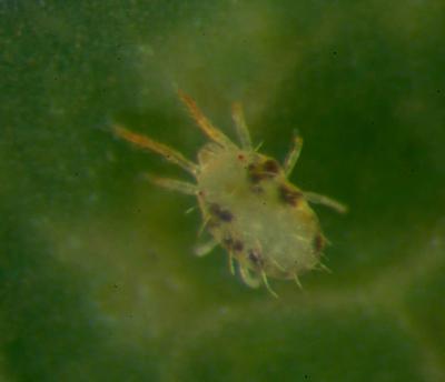 Female of the cassava green mite (Mononychellus tanajoa), real size 0.8 mm.