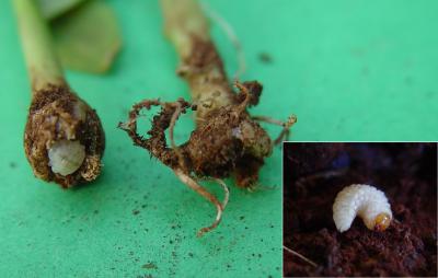 Damage to French bean plants by larvae of the stripped bean weevil. Note larva inside stem. Inset- close-up of larva.