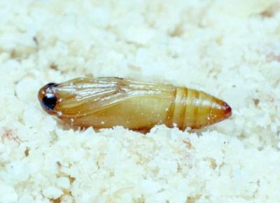Pupa of grain moth. The final-instar larva spins a silken cocoon and changes to a reddish-brown pupa.