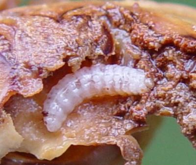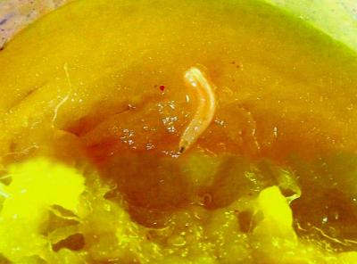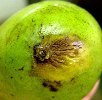 Egg of mango seed weevil on mango fruit. The very small egg laying scars are barely discernable at harvest.