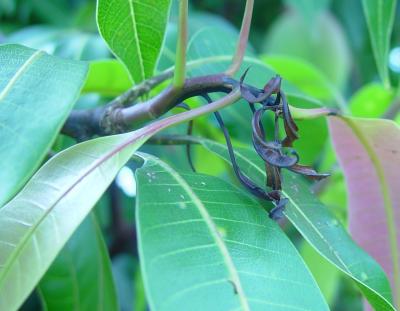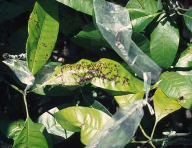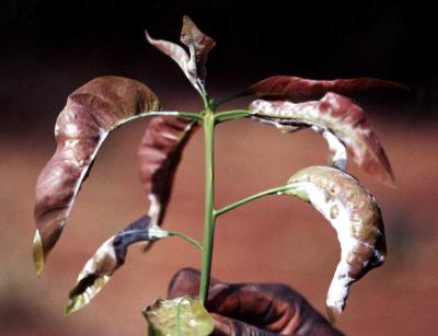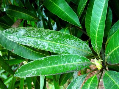 Mango leaves showing symptoms of leaf-coating mite attack.