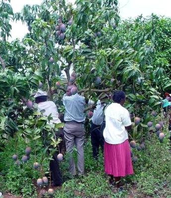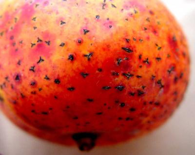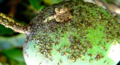Bacterial black spot symptoms on mango fruit. Note star-like cracks on the fruit.
