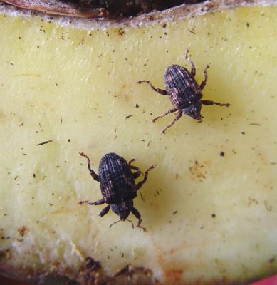 Mango seed weevil adult, after emerging of from a mango. Realsize: 8 mm long.