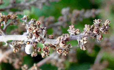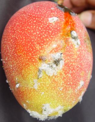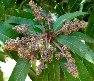 Mango panicle affected by powdery mildew. Note white powdery growth and low fruit set.