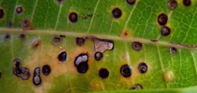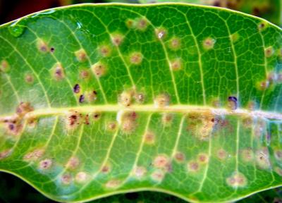 Bacterial black spot (Xanthomonas campestris pv. mangiferaeindica) on mango leaves