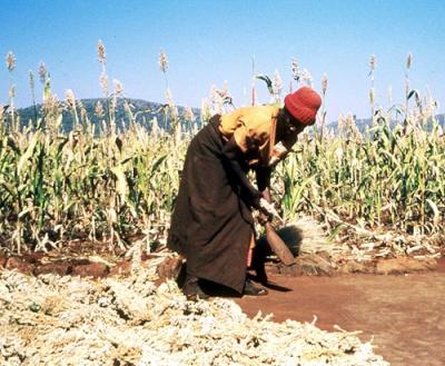 Sorghum grain heads are dried in the sun on the threshing floor until the seeds drop easily. Threshing is done with a patole - a hand held flattened instrument made from torchwood.