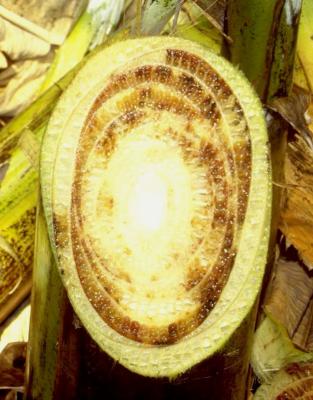 Pith discolouration of banana pseudostem caused by Fusarium wilt.