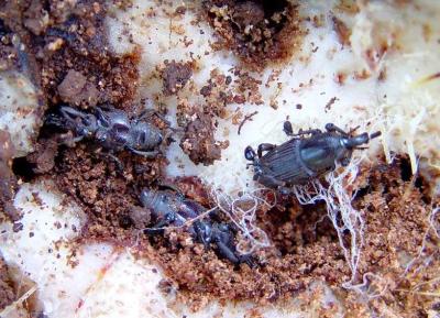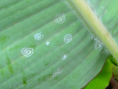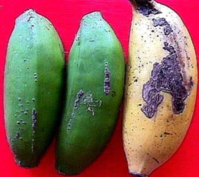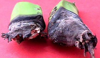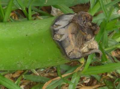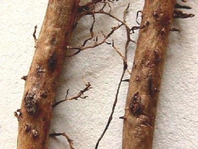 Burrowing nematodes on banana roots. Note brown lesions (patches) caused by the nematodes.