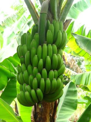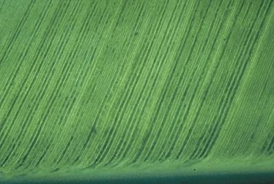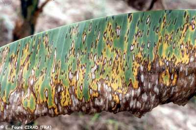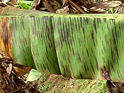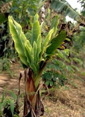 Fusarium wilt symptoms (Fusarium oxysporum f.sp. cubense) on banana leaves. Banana cultivar 'Bluggoe' with yellowing symptoms on lower leaves