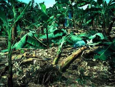 Toppled bananas due to root damage caused by Radopholus similis, the burrowing nematode.