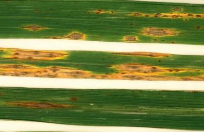Blast (Pyricularia grisea). Lesions on rice plant leaves.