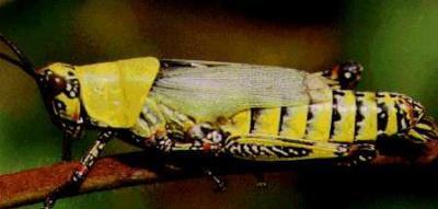 Variegated grasshopper (Zonocerus variegatus). The size of adult grasshoppers may vary between 300 mm and 520 mm.