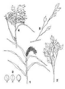 Millet (Panicum miliaceum) Line drawing: 1.) habit flowering stem; 2.) detail inflorescence branch; 3.) grains; cv. subgroup Miliaceum:- 4.) habit flowering stem; 5.) detail inflorescence branch.