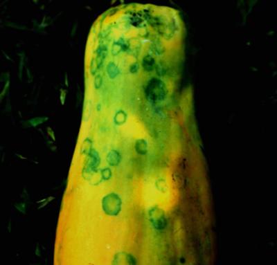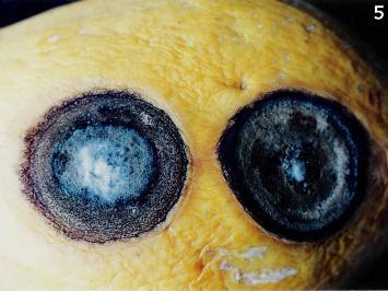 White fungal crusts of white mycelium associated with fruit rot of papaya (Phytophthora palmivora).