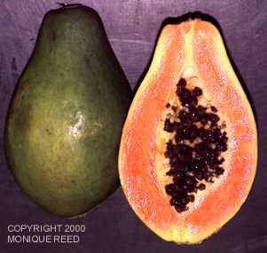 Pawpaw (Carica papaya). Mature fruit cut upen.