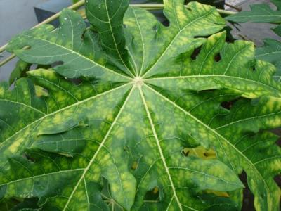 Papaya ringspot potyvirus - Severe mosaic and distortion on young leaves.