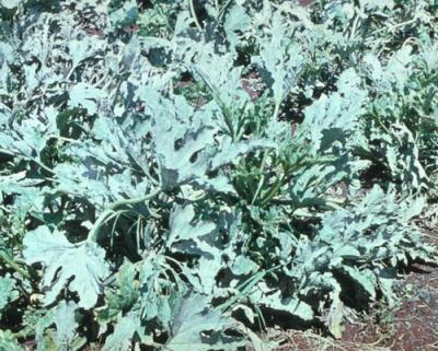 Downy mildew (Pseudoperonospora cubensis) on cucumber. Severe defoliation of cucumber caused by infection from downy mildew. Fruits are not infected, but those that form are small and do not ripen properly.