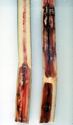 Pineapple black rot - Reddening, followed by black areas of rot, on stems of sugarcane with pineapple disease caused by Ceratocystis paradoxa