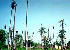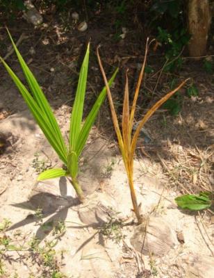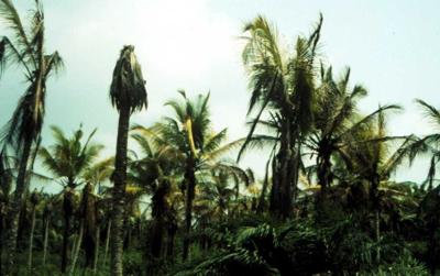 Lethal yellowing disease of coconut palms. Note yellow leaves and a dead palm without leaves.