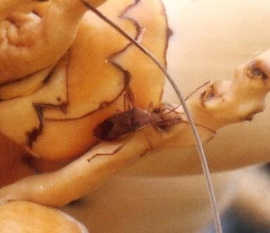 Coconut damaged by the coconut bug. Inset: adult of the coconut bug