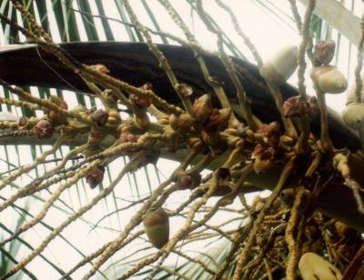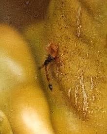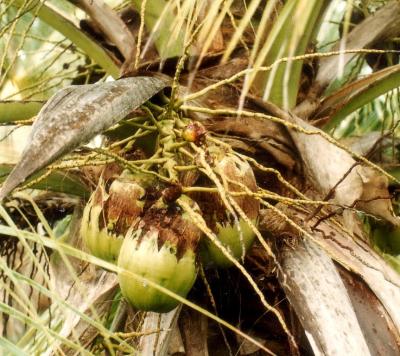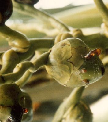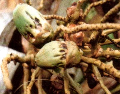 Young nuts (nutlets) showing gummosis due to feeding by the coconuts bug