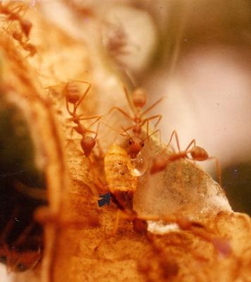 Weaver ants preying on nymph of coconut bug (marked by black arrow)