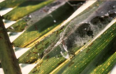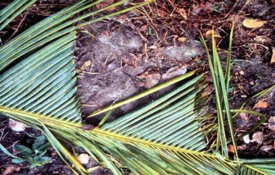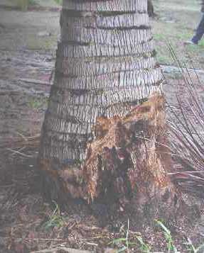 Coconut leaf showing damage by the rhinoceros beetle. Note typical V-shaped damage.