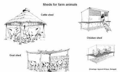 Sheds for farm animals Traditional simple sheds in Senegal: cattle shed, goat shed, chicken shed