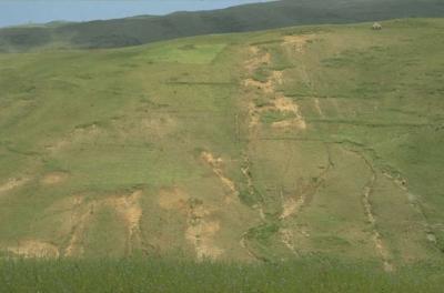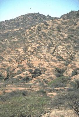 Erosion form overgrased communal land: gully and sheet. Even with good tree bush cover, erosion is high (Kenya).