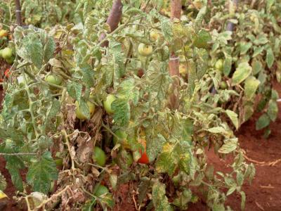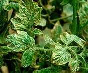 Spider mites on tomato. Note the mites and their webbing visible between the leaves.