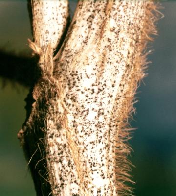 Infected tissues are covered with black fruiting bodies (conidiomata) which produce minute black spines (setae) that can be seen with the unaided eye.