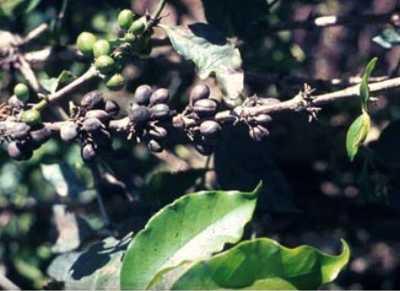 Anthracnose (Colletotrichum coffeanum) on coffee (Coffea arabica) plant. Branch with mummified berries.