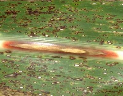 . (Glomerella tucumanensis It produces tiny reddish lesions (2-3 mm long and about 0.5 mm wide) on the upper surface of the lamina and their abundance gives it a rusty-brown appearance. In the mid-rib, lesions usually start as minute red spots on the upper surface and develop in both directions, forming small, long lesions. The spots are red to begin with, but later become straw coloured with dark reddish-brown margins.