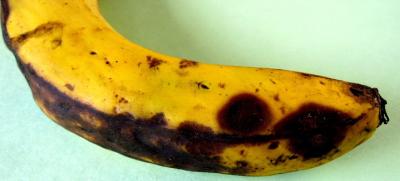Anthracnose (Colletotrichum musa) on banana. As is in most fruits, symptoms manifest during ripening of the fruits. They are round, sunken, dark brown to black in colour, and when it is damp they become covered with a mass of pink spores