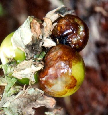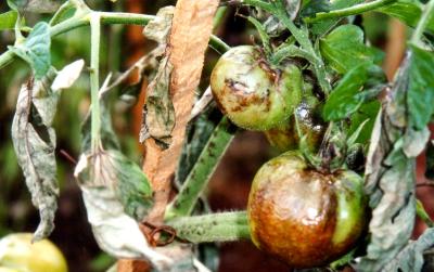 Late blight on tomatoes. Note scorched appearance of leaves stems and fruits.